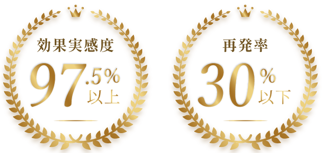 当院患者様アンケートの結果、97.5%以上の患者様が効果を実感しています。また、再発率は30%以下です。(※2025年4月〜9月)